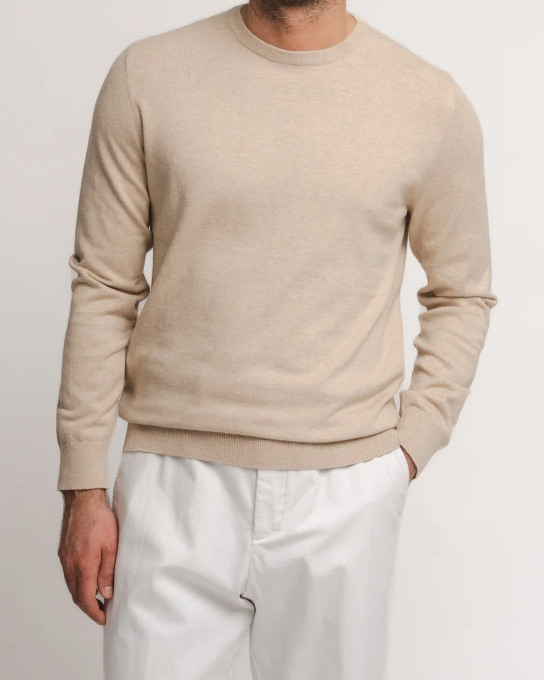 Bež pamučni kašmirski džemper s okruglim izrezom