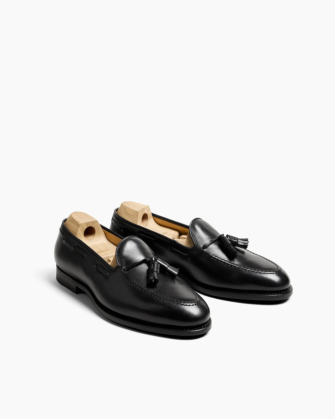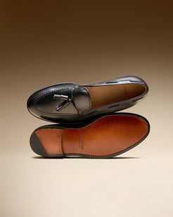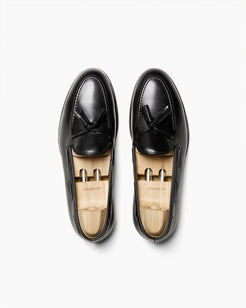 Mölle II made by Myrqvist showcases refined elegance with its apron front design and tasteful tassel detailing. Crafted in black calf leather with a single leather sole, this loafer offers exceptional comfort through its well-considered design, featuring enhanced arch support and a perfectly balanced fit.