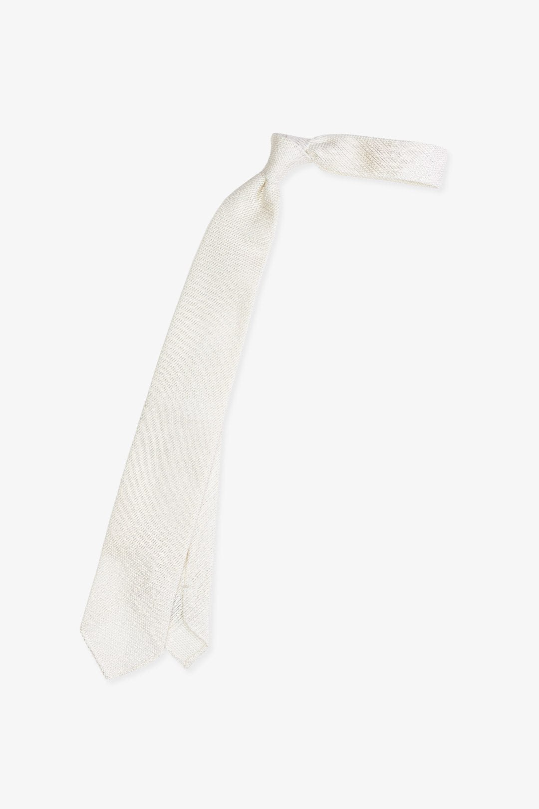 Woven from the lightest grenadine silk in a subtle ivory tone. Untipped for a softer drape, with hand-rolled edges—crafted entirely by hand in Italy. A quiet statement of elegance.