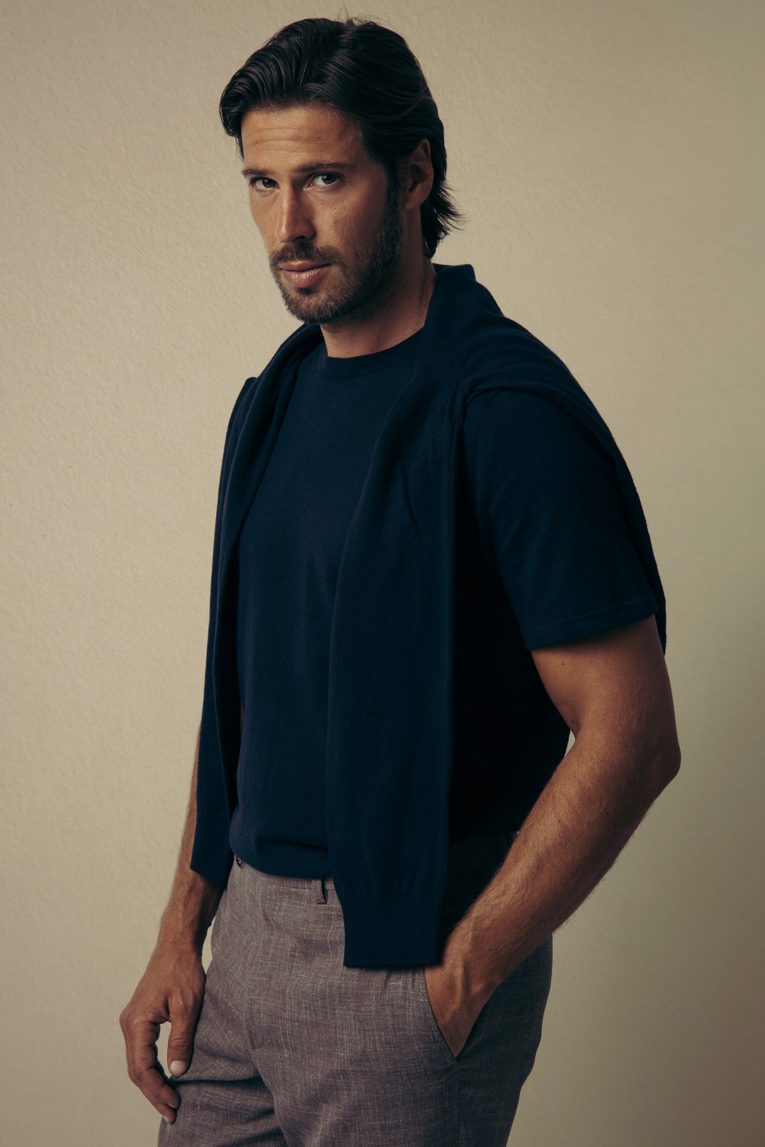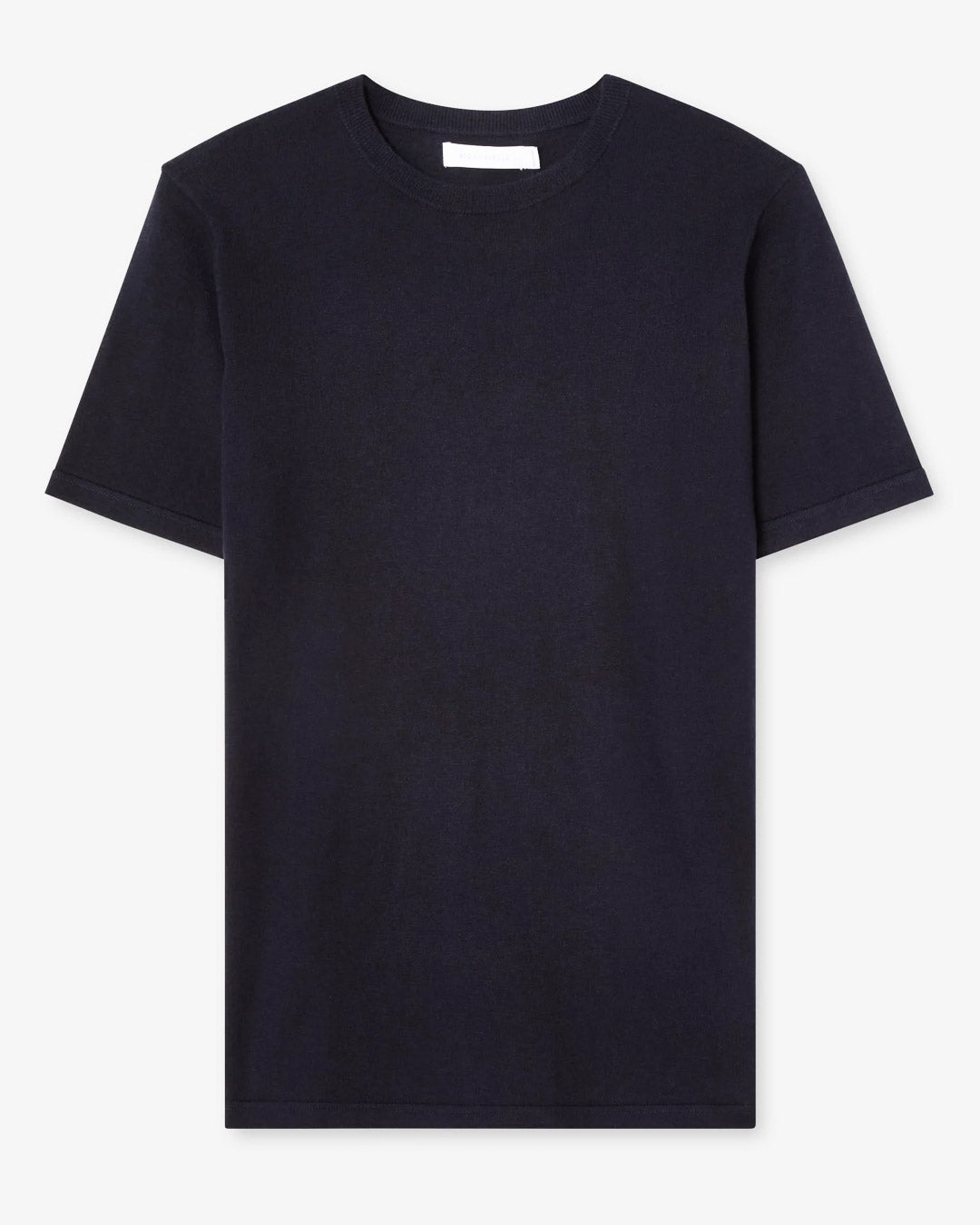 Tamnoplava pamučna kašmirska pletena majica kratkih rukava