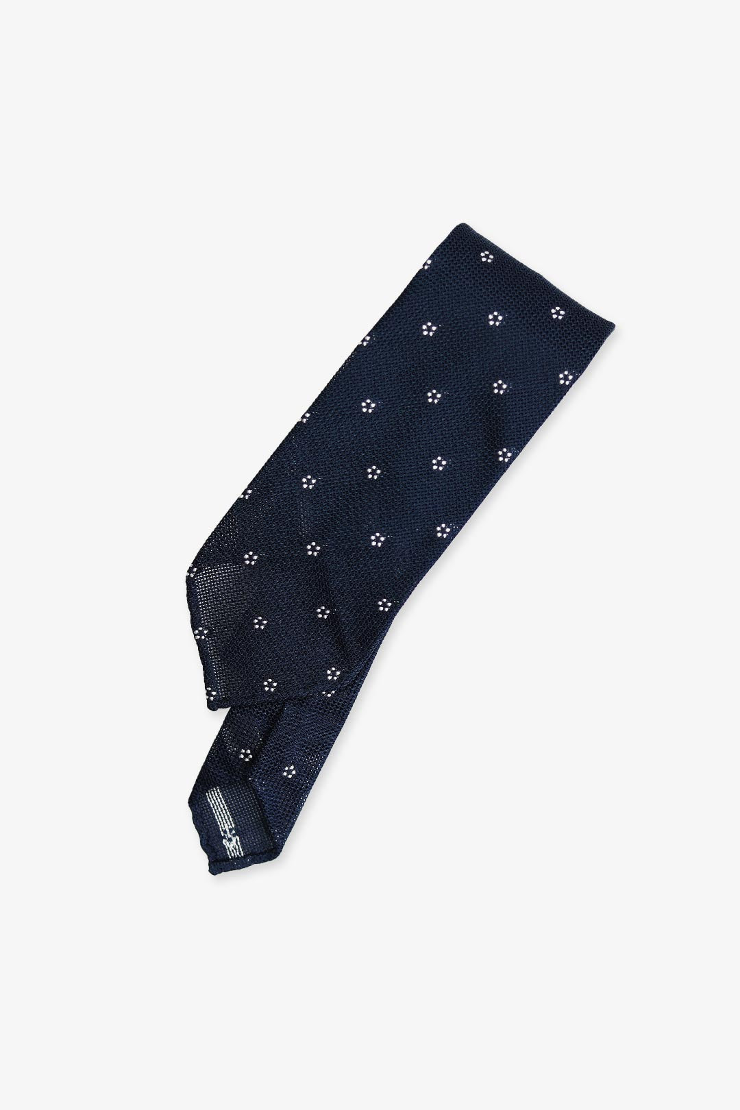 Navy Blue is a perennial classic. White flowers lend a quiet elegance. Crafted in pure silk with an untipped grenadine weave and hand-rolled edges — a refined choice for every season.