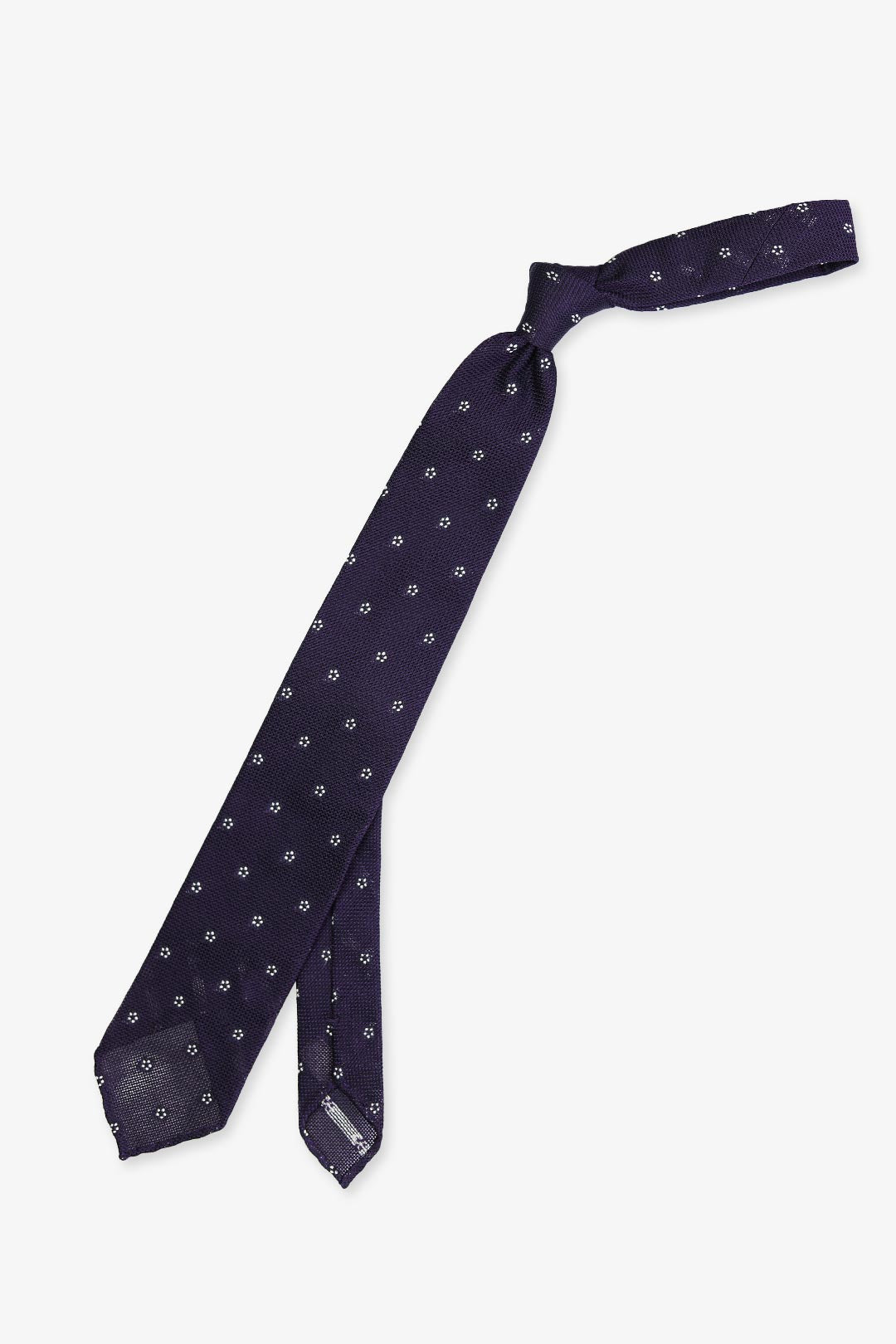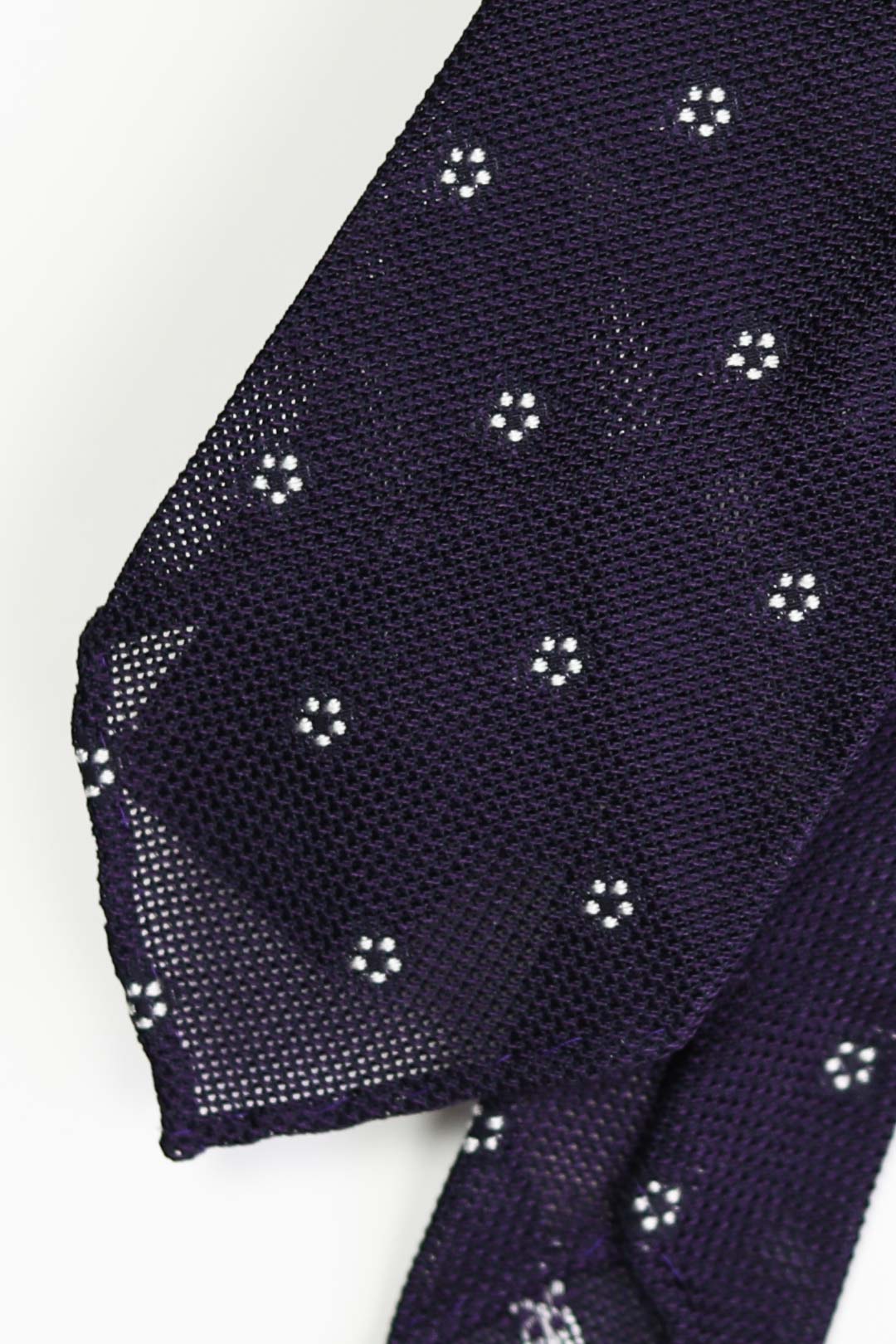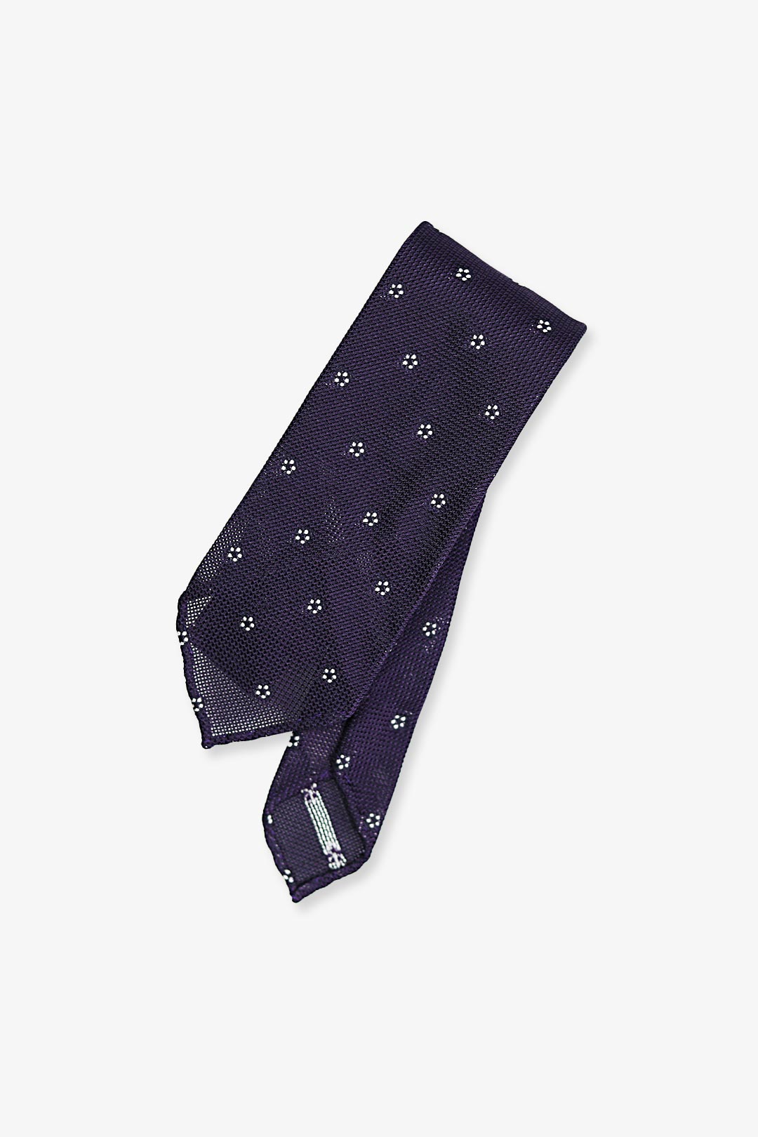 Purple — a timeless gesture of quiet confidence. White flowers add a discreet charm to the richly textured grenadine weave. Crafted in pure silk with an untipped construction and hand-rolled edges — a refined choice for every season.