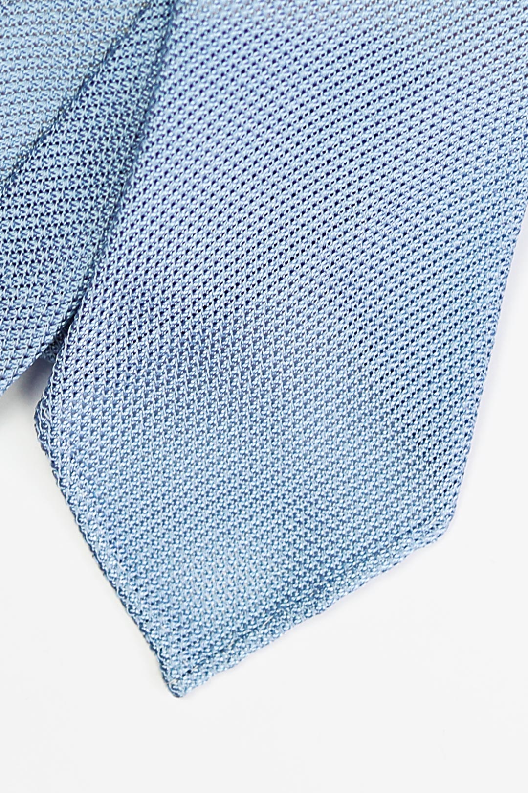 Woven from the lightest grenadine silk in a subtle sky blue tone. Untipped for a softer drape, with hand-rolled edges...