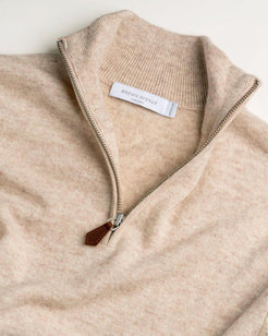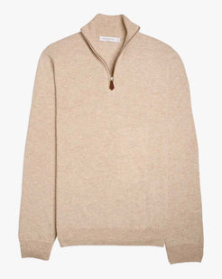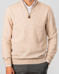 The sophisticated beige hue and practical half-zip by Brown Avenue, make this sweater an essential addition to every style-conscious man's wardrobe. With its combination of merino and cashmere, it offers superior softness, warmth, and durability. This beige half-zip sweater is perfect for both everyday and formal occasions.
