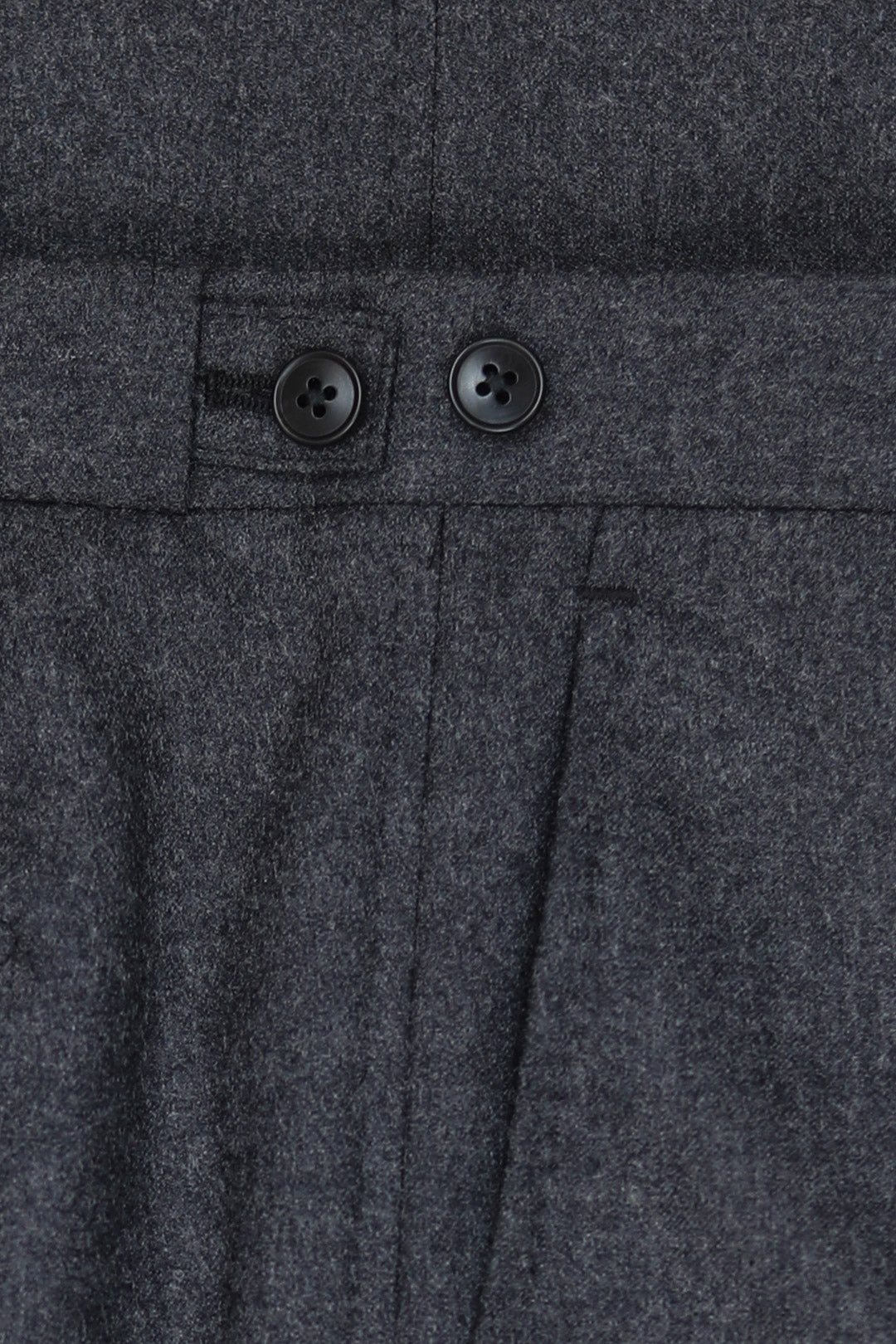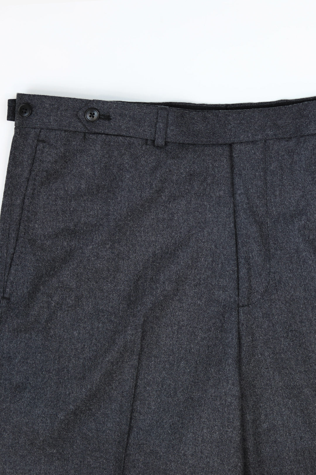 Trousers follow the same measured rhythm, cut with a mid-rise and finished with an extended waistband and vintage-leaning button-and-tab side adjusters. A composed, understated ensemble for those who appreciate nuance over noise.