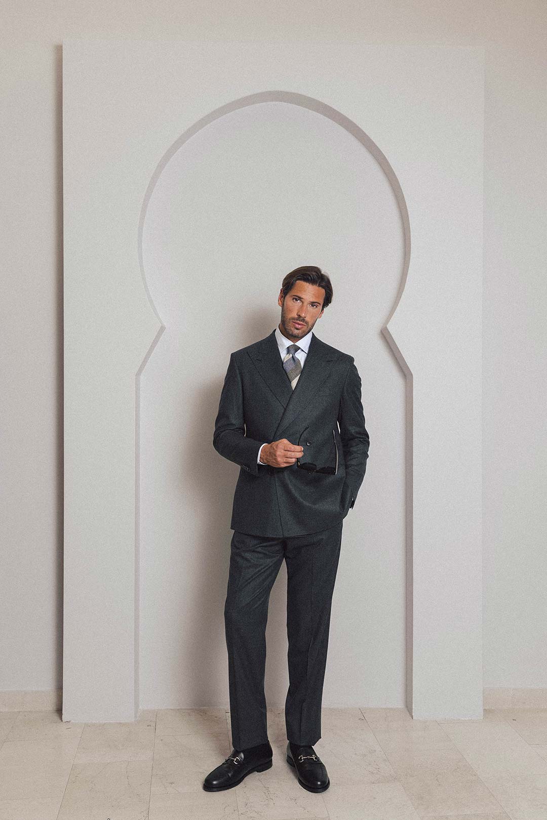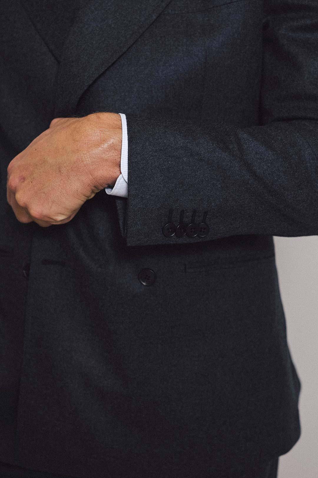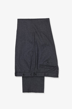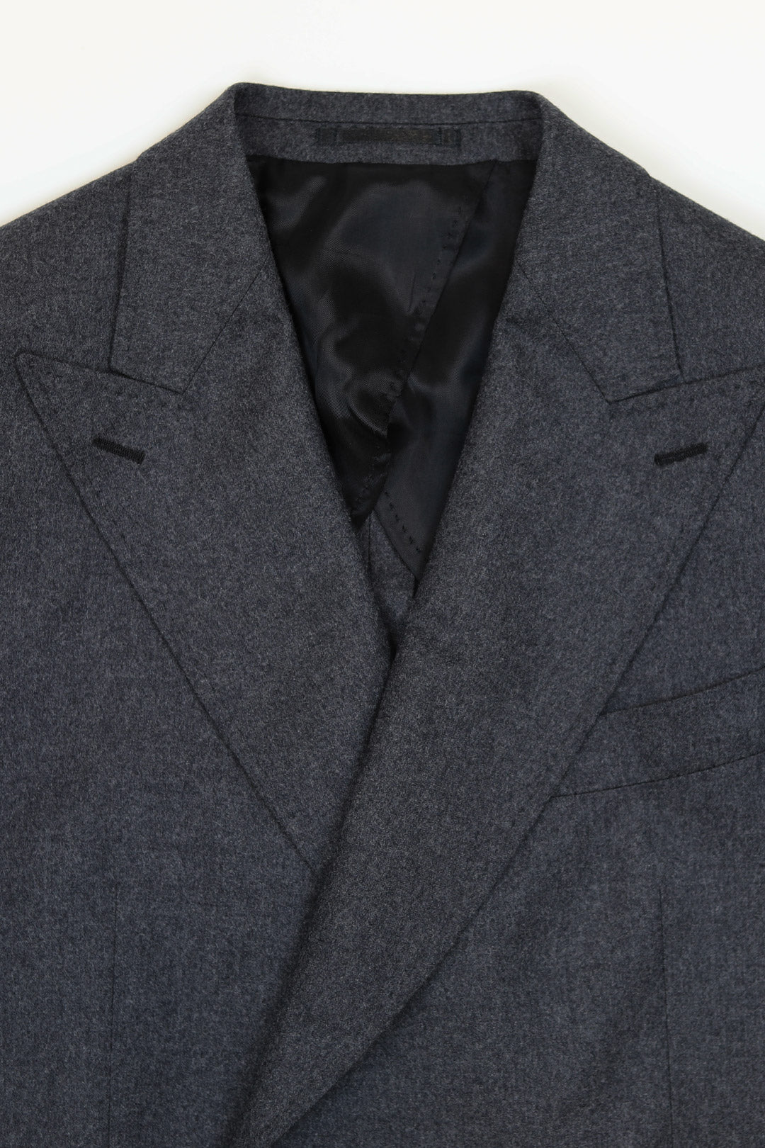 House-cut suit in a soft, superfine 120s wool flannel, woven in Italy with a quiet richness. The jacket is pared back and refined — clean jet pockets, an easy, unstructured shoulder, and a silhouette that moves with intent rather than insistence.