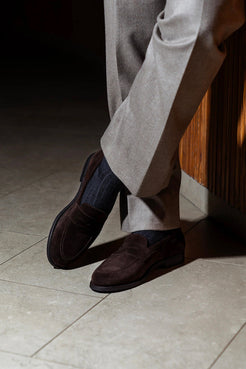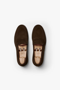 Stenhammar II made byMyrqvist in dark brown suede is an apron fronted penny loafer built on a rounded and wider last, finished with a bespoke full rubber sole. Created with generous proportions and a secure heel fit, this classic design offers exceptional comfort without compromising on style.