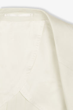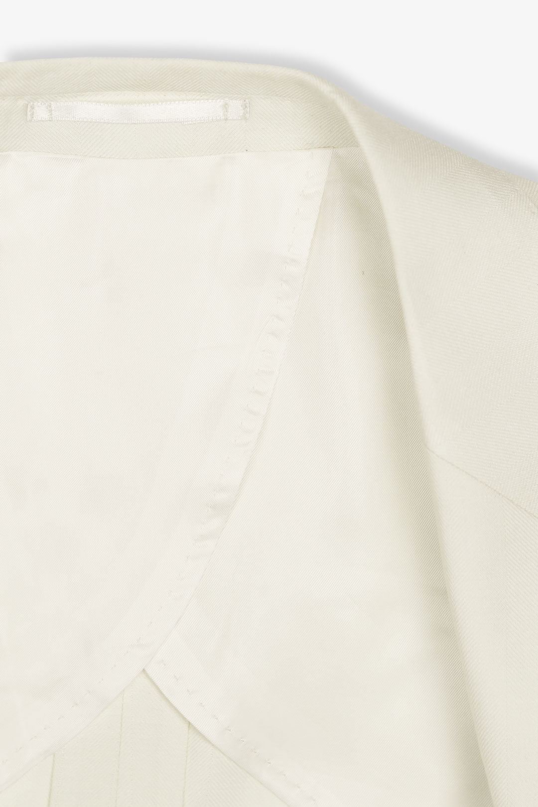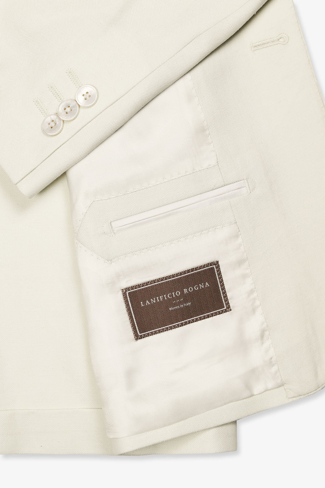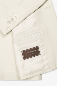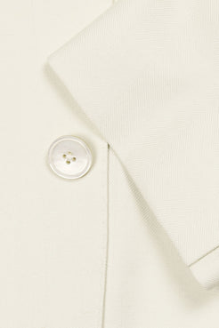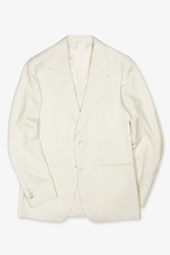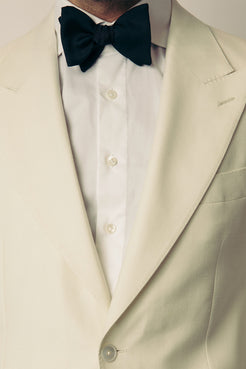 Cut from an exceptionally soft wool, silk, and linen cloth by Lanificio Rogna, with a quiet herringbone weave that lends subtle texture and depth. The silhouette is timeless — peak lapels, natural shoulders, and classic jet pockets — designed to flatter without flourish. Finished with mother of pearl buttons, it’s a piece that carries grace with ease — equally suited to ceremonial moments or the quiet elegance of a summer soirée.