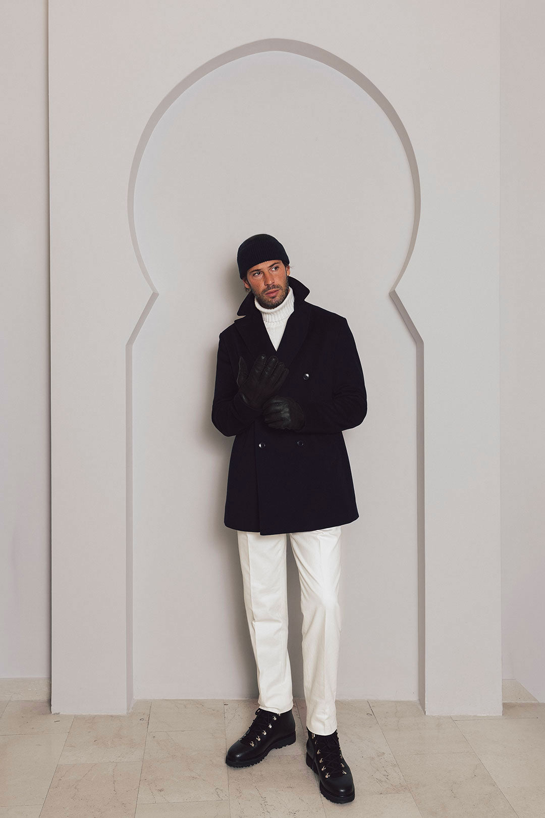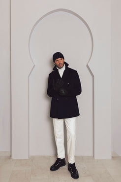 A timeless icon reimagined with modern performance. Crafted from Loro Piana’s signature "Rain System" wool, this pea ...
